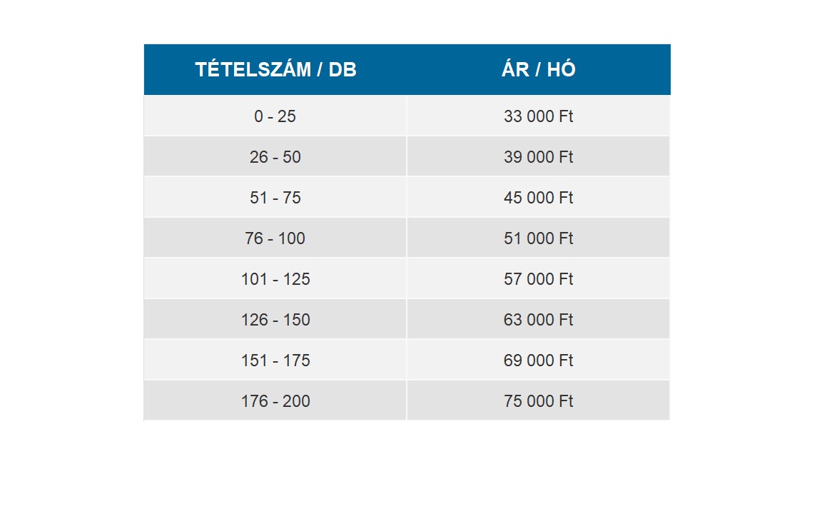 Kimenő és bejövő számlák, banki tételek száma, bérfeladási tételek. A tételszám alapján változhat a havi díj, annak függvényében, hogy a vállalkozás mennyire dinamikusan működött vagy éppen mennyi bevételt ért el az adott hónapban. Így Ön mindig a vállalkozása működéséhez szabott, aktuális és korrekt vállalási díjat fogja fizetni.